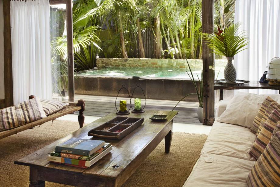 Dentro das acomodações espaçosas, que não saem por menos de R$ 2.110 a noite, a madeira recuperada dos móveis contrasta com o branco das paredes e dos dosséis que envolvem a cama. Antiguidades posicionadas aqui e ali completam a decoração.