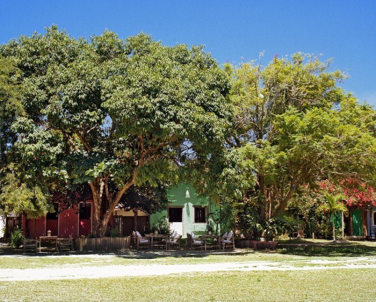 As casas rústicas, que hoje se somam a outros nove chalés, ficam em torno de uma piscina forrada de quartzo aventurina verde, mineral natural da Bahia famoso por suas propriedades terapêuticas. Ali perto, um caminho ladeado por manguezais leva à praia de areia fina, onde são montadas espreguiçadeiras. Um bar pé na areia feito à partir de antigos barcos de pesca fica responsável pelo preparo das caipirinhas, enquanto o restaurante do hotel é especializado em comida típica baiana.
