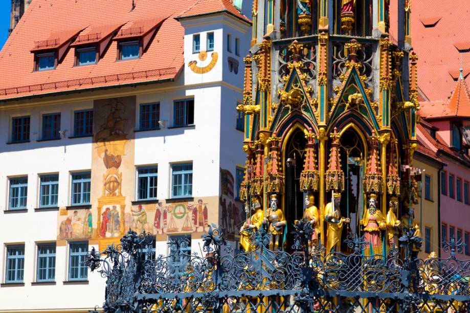 E a Schöner Brunnen, fonte gótica com 19 metros de altura, dourada e decorada com gárgulas, onde as pessoas disputavam lugar para girar um anel de ferro preso à grade (existem dois anéis que ficam em lados opostos: um é pra desejos genéricos, e o outro, pra fertilidade; melhor não confundir as coisas).