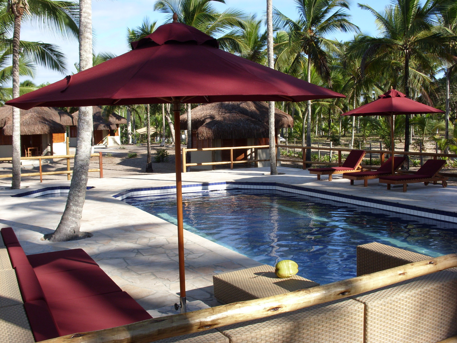 Num canto isolado da praia e de frente para o mar, o terreno repleto de coqueiros abriga espaçosos chalés.