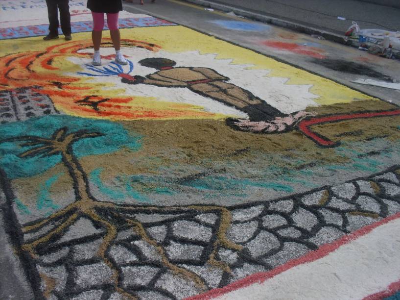 Serragem colorida, borra de café, farinha, areia, flores, folhas e pequenos acessórios como tampinhas de garrafas formam desenhos artísticos com figuras e dizeres relacionados à festa.