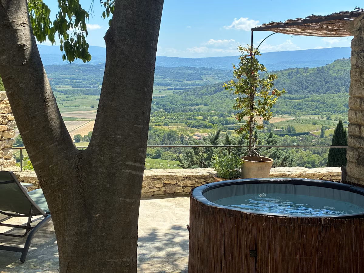 A casa: Projetada para casais, esta casa aposta na simplicidade. Com madeira e móveis em alvenaria, o espaço cria um refúgio íntimo e acolhedor para os hóspedes. O quarto possui uma cama-queen e vista para uma árvore que protege a fachada. O terraço florido é o grande destaque da hospedagem: ele envolve toda a construção, e, sob o pergolado, uma jacuzzi aquecida convida a relaxar diante da vista panorâmica do Luberon. O acesso se dá por uma escadaria curta, que realça a sensação de estar escondido em meio à natureza. Reserve aqui.