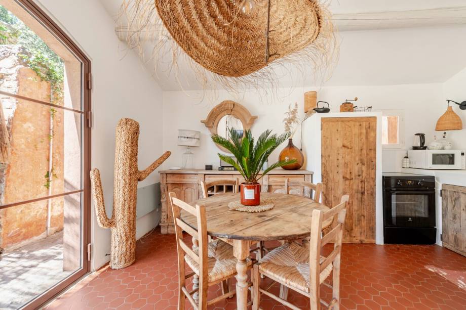 A casa: Com vista para o vilarejo em tons de ocre de Roussillon, esta casa exala o charme de uma fazenda colorida. Escondida atrás de um muro de pedra e rodeada por lavandas, oliveiras e pinheiros, ela conta com um jardim amplo, com piscina de água salgada. Do lado de dentro, há cozinha equipada, ar-condicionado, TV e detalhes como livros, decoração em palha e almofadas que lembram casas de vó. A sala de estar convida para momentos de descanso no sofá e nas cadeiras de palha, enquanto o quarto no térreo, acessível pelo jardim, garante privacidade e aconchego. Entre a lareira decorativa e a jacuzzi, a hospedagem encontra um equilíbrio entre charme rústico e comodidade. Reserve aqui.