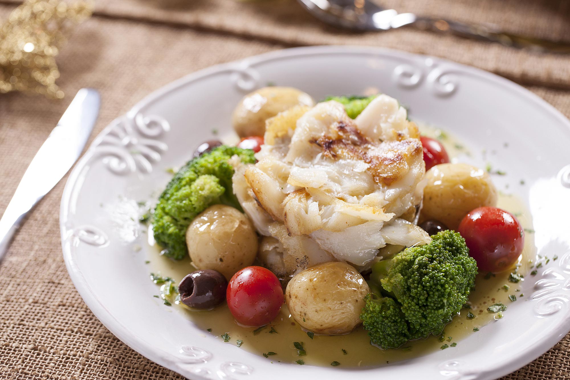 Camarão ao curry, creme de leite e coentro, servido com arroz de amêndoas; e bacalhau à lagareiro (dourado no azeite com batatas ao murro, alho, cebola, brócolis e azeitonas).
